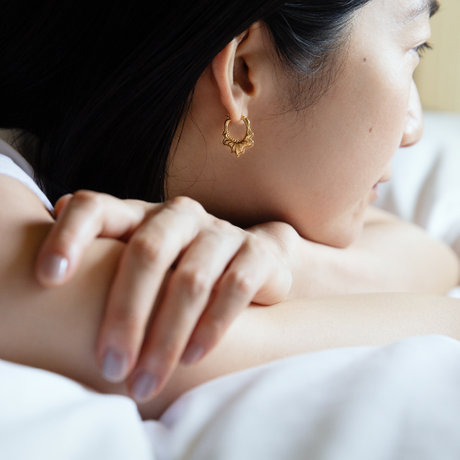 2025.09.15 ete bijoux 2025 AW Collection "Inner Journey" -Hoop Pierce- オリエンタルな紋様やシルエットを思わせるフープピアス。エイジング加工を施し、長い年月を経て手元に届いたような年月を感じさせるような仕上がりに。日常から少し離れ、自分自身と向き合う静かな時間を、ジュエリーというかたちで映し出す。揺れ動く感情や、胸の奥に眠っていた想いに、そっと寄り添ってくれるよう。 [インナージャーニー] フープピアス ¥38,500 [インナージャーニー] マルチストーン/スピネル フープピアス ¥42,900 [インナージャーニー] フープピアス ¥38,500 [インナージャーニー] マルチストーン/スピネル フープピアス ¥42,900