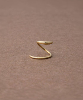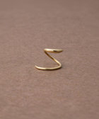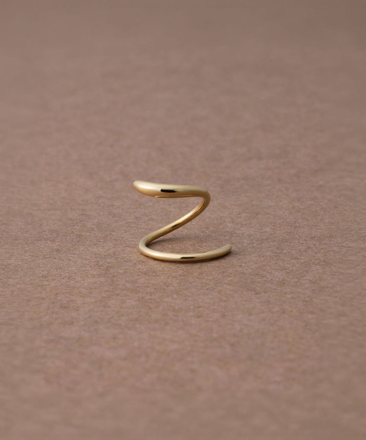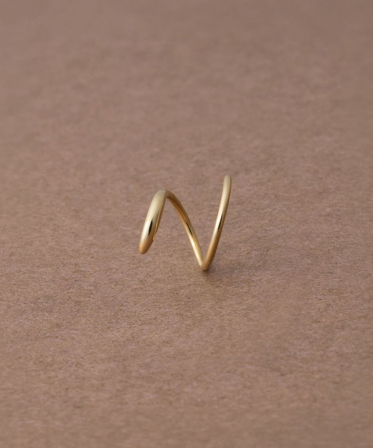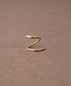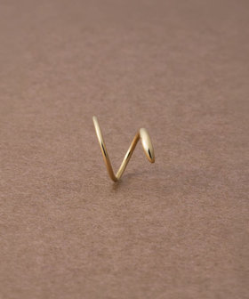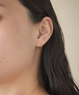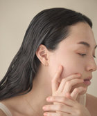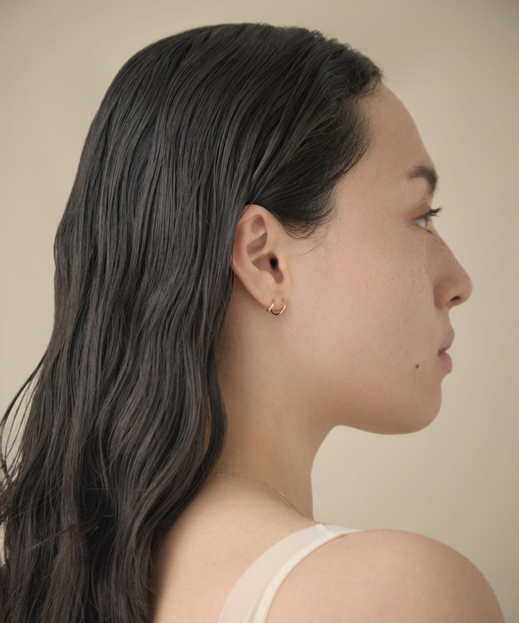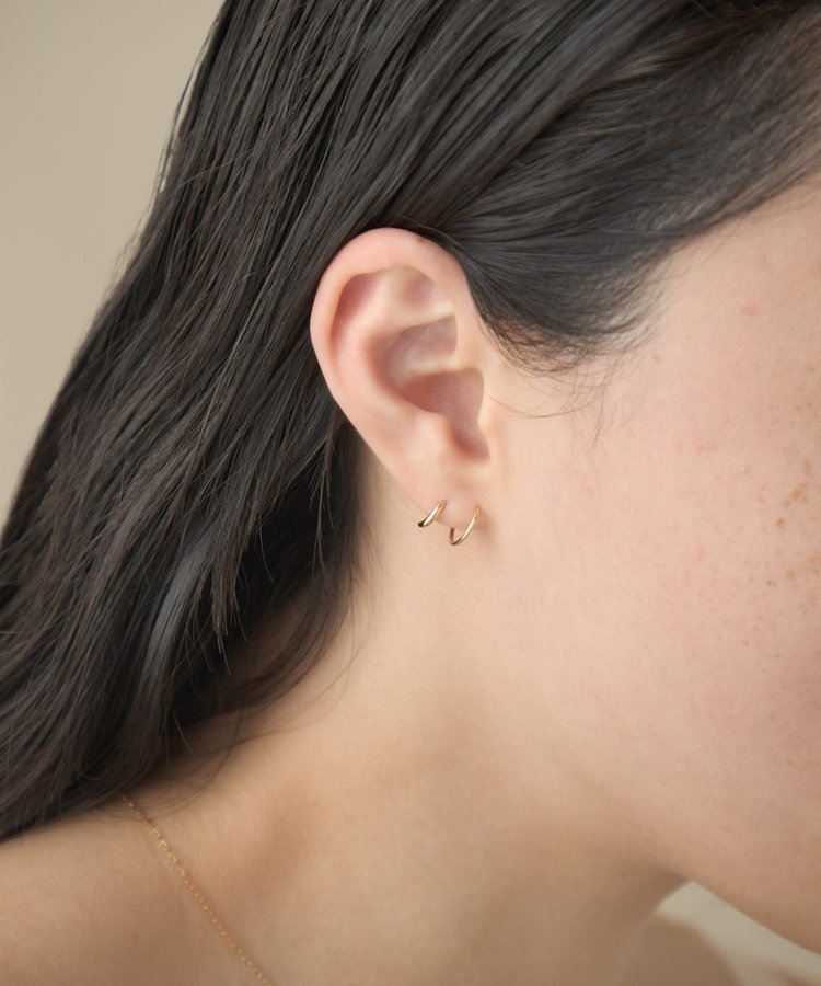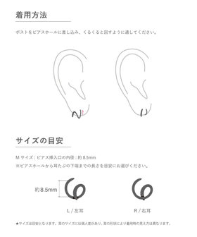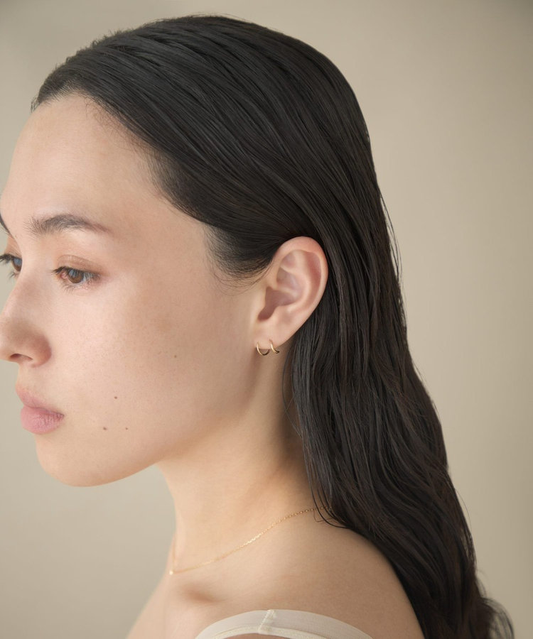 細いポストをピアスホールに差し込み、くるくると回すように通せば、2つのピアスを着けたようなシルエットに。