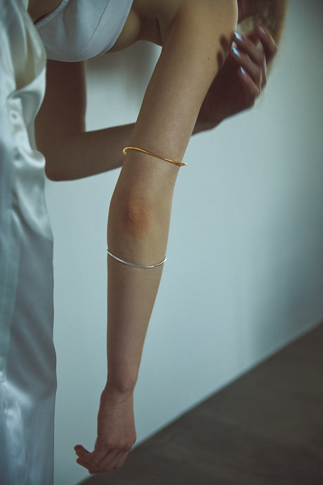 2024.07.16 Summer 2024 Collection "Arm Cuff" 腕の上部で流れるようにフィットする"アームカフ"。しなりのあるラインが存在感を放ち、腕元をスタイリッシュに仕上げます。前後の向きを変えてみたり、腕のお好きな位置でご着用いただくなど、幅広いアレンジが楽しめます。シアーな質感の長袖や、シャツの上からのレイヤードもおすすめです。